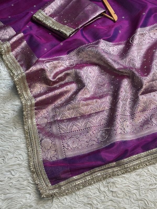 “Our exclusive Banarasi [TISSUE SILK SAREE WITH PANSTING HANDWORK] is designed to enhance your beauty and add a touch of tradition and elegance to every occasion. Made from high-quality fabric with intricate patterns, this saree offers both comfort and style. The full length of 5.5 meters ensures a graceful drape and easy styling for all body types.