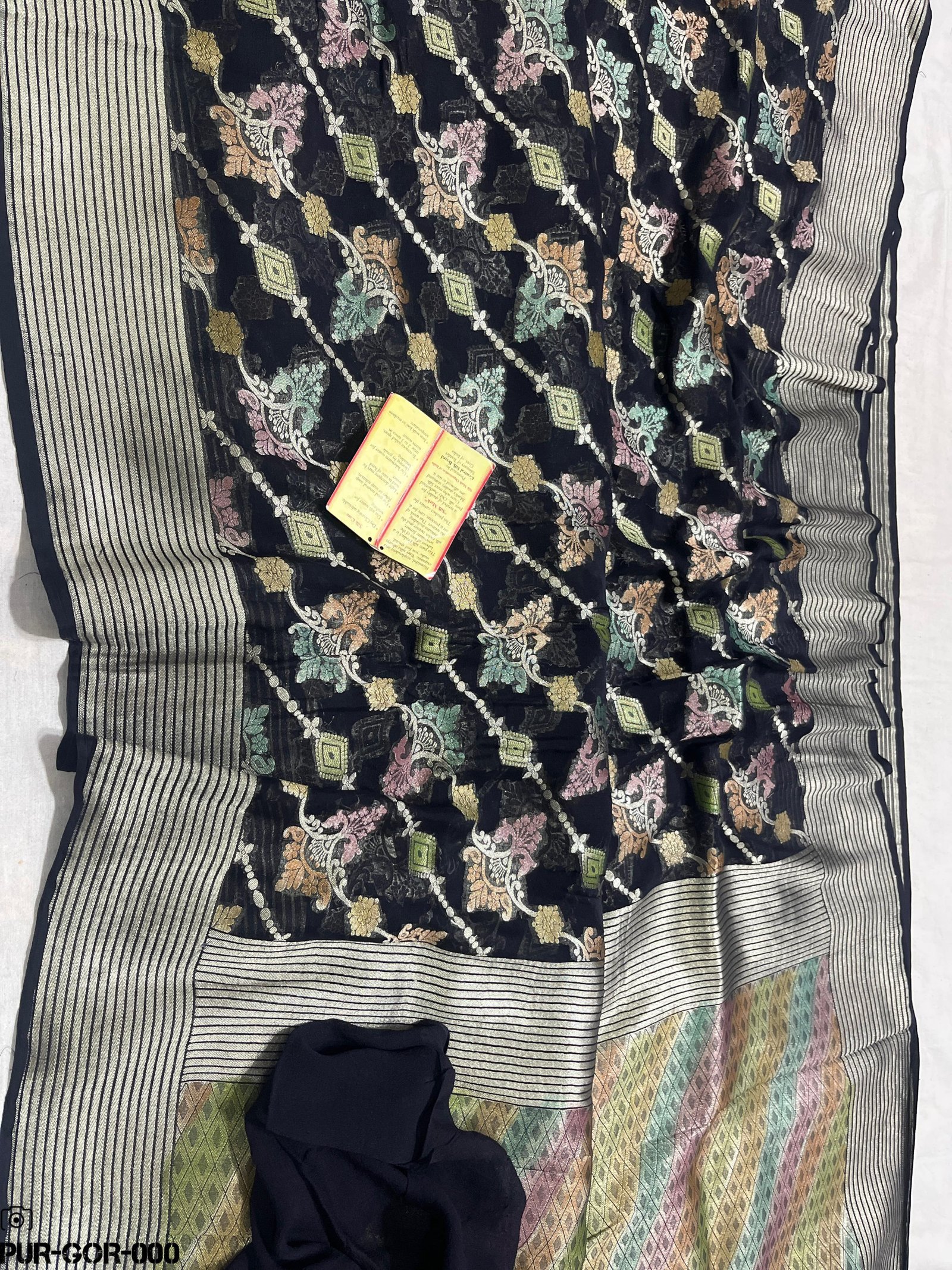 “This beautiful Banarasi [PURE KHADDI GEROGETTE SAREE ] is crafted with elegance and premium quality fabric. With a length of 5.5 meters, it is perfect for weddings, parties, festivals, and special occasions. Available in a wide range of colors – you can customize it as per your preference. For more details or inquiries, feel free to WhatsApp us anytime!”