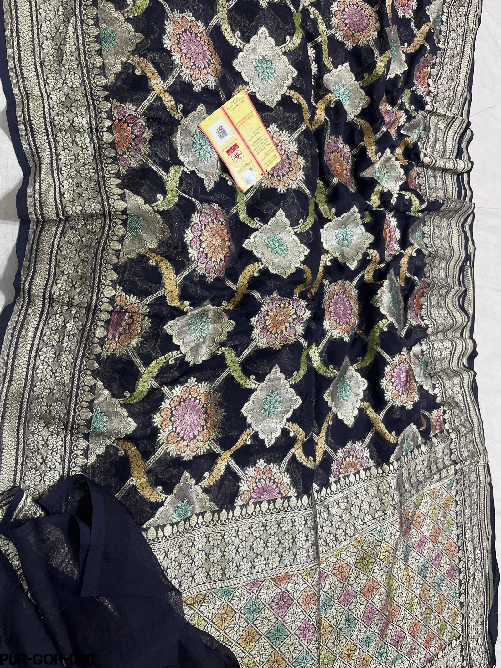 “Our exclusive Banarasi [PURE KHADDI GEORGET SAREE] is designed to enhance your beauty and add a touch of tradition and elegance to every occasion. Made from high-quality fabric with intricate patterns, this saree offers both comfort and style. The full length of 5.5 meters ensures a graceful drape and easy styling for all body types.