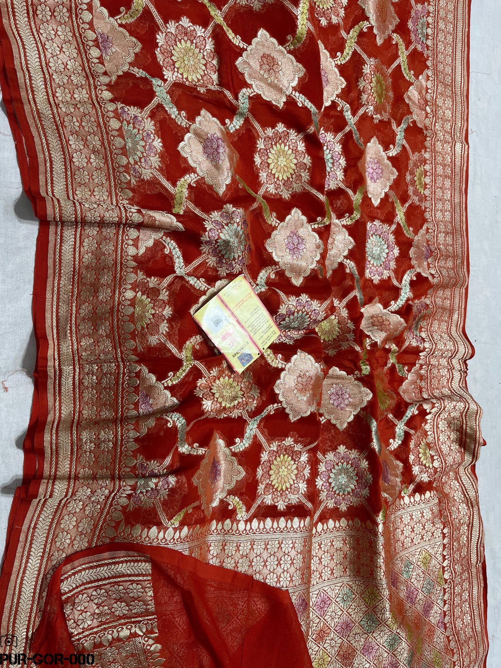 “This beautiful Banarasi [PURE KHADDI GEROGETTE SAREE ] is crafted with elegance and premium quality fabric. With a length of 5.5 meters, it is perfect for weddings, parties, festivals, and special occasions. Available in a wide range of colors – you can customize it as per your preference. For more details or inquiries, feel free to WhatsApp us anytime!”