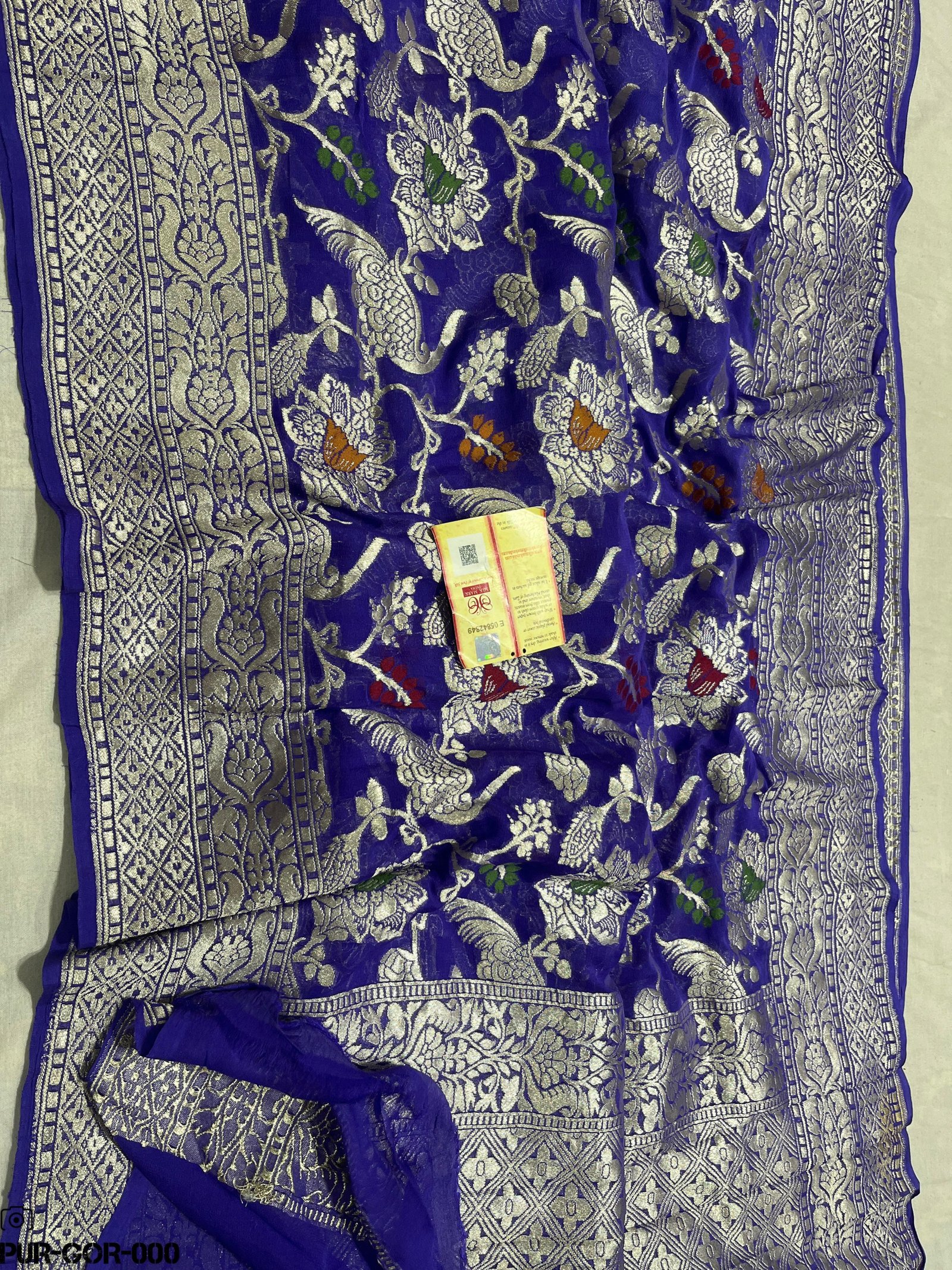 “This beautiful Banarasi [PURE KHADDI GEROGETTE SAREE ] is crafted with elegance and premium quality fabric. With a length of 5.5 meters, it is perfect for weddings, parties, festivals, and special occasions. Available in a wide range of colors – you can customize it as per your preference. For more details or inquiries, feel free to WhatsApp us anytime!”